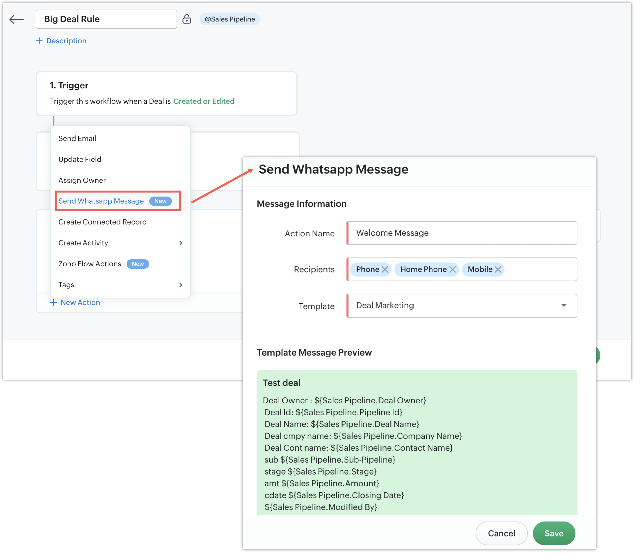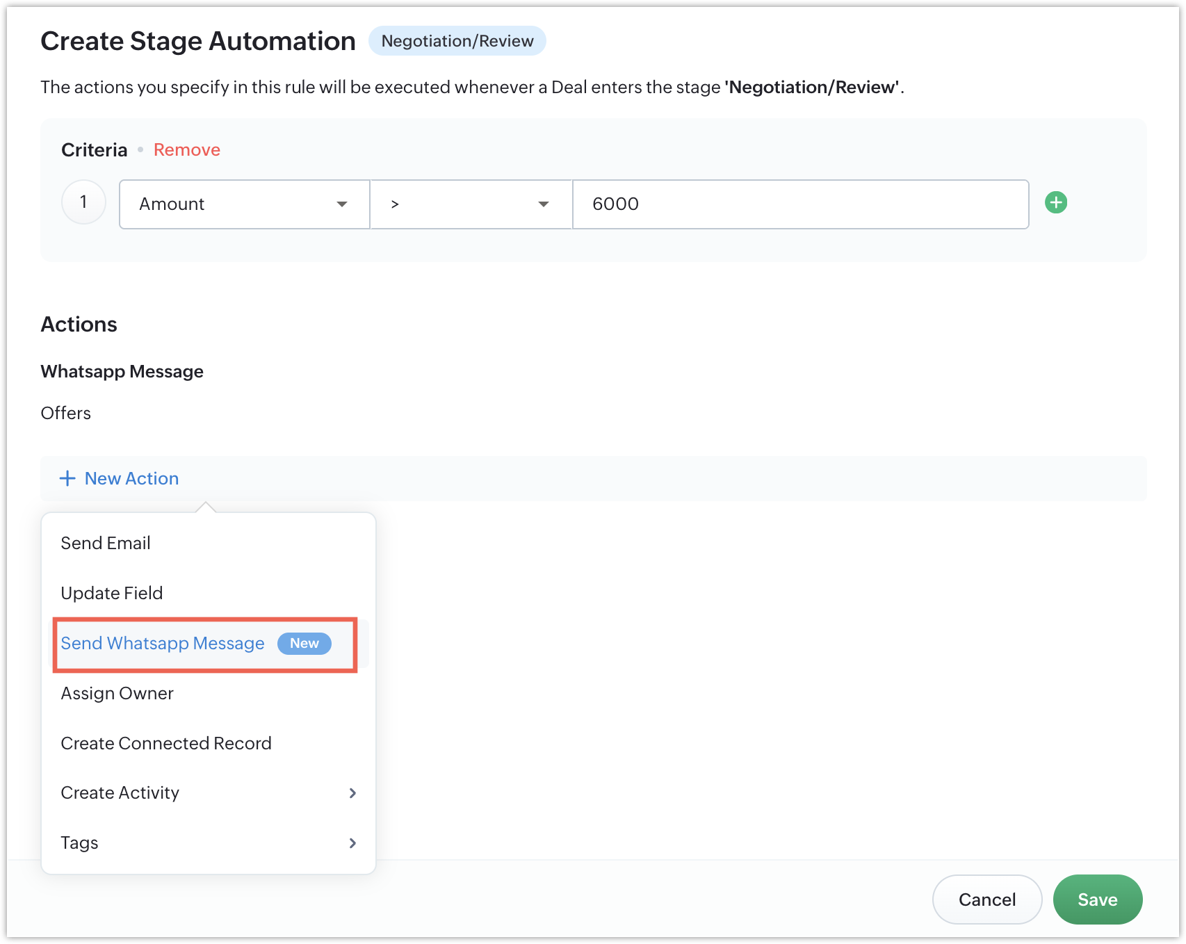 In addition, you can include WhatsApp messages in stage automations. That means whenever a record shifts into a certain stage, a personalized WhatsApp message will be triggered automatically, ensuring smoother and more timely communication.