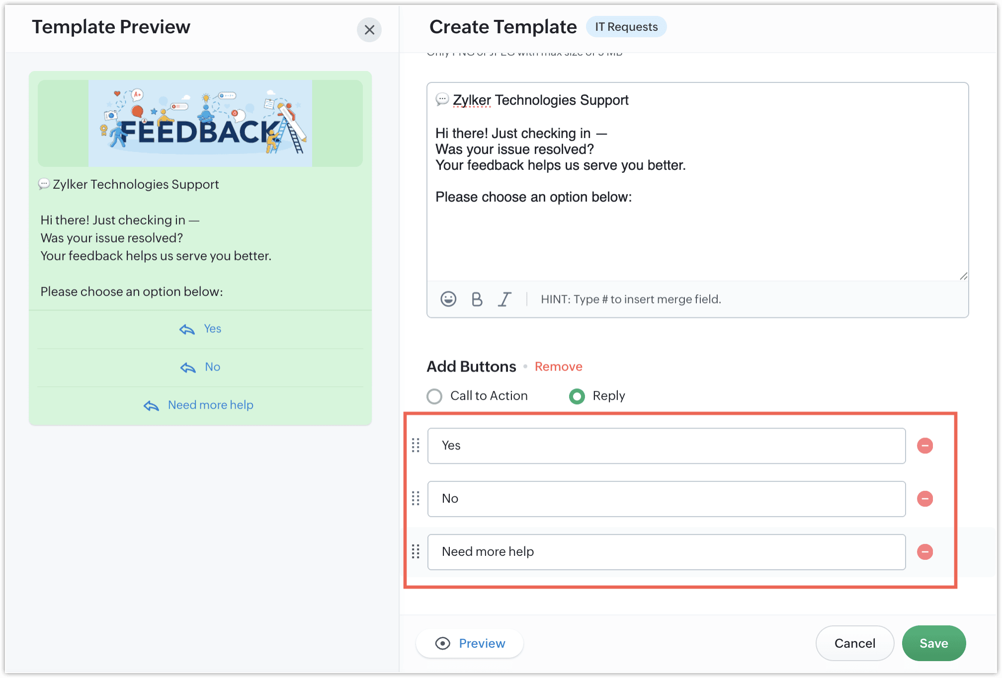 Note: A single template can include either call-to-action buttons or quick replies, not both.