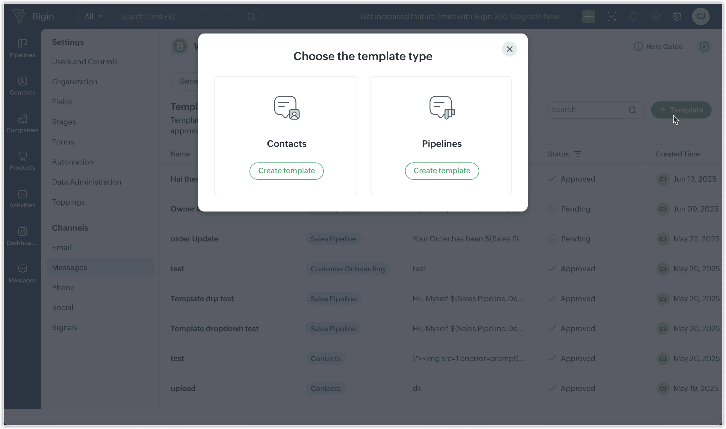 Go to Setup > Messages > Templates, click + Template, and select the module where you want to use it.
