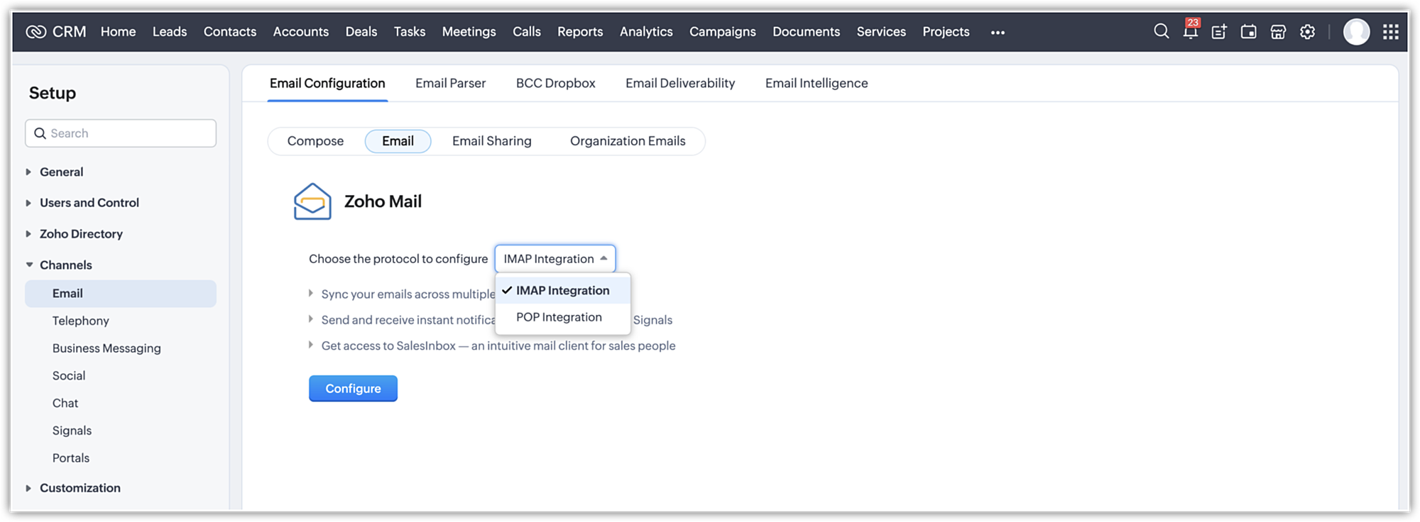 Integrating your email account via POP3 will now create a SalesInbox account automatically. Previously, POP3 users had to integrate their CRM account with Zoho Mail, which created an Email module in the CRM account. With this new enhancement, emails will now sync with SalesInbox directly, and as a result, the Email tab will be removed from CRM for all users. Additionally, you can now import filters during the integration process itself.