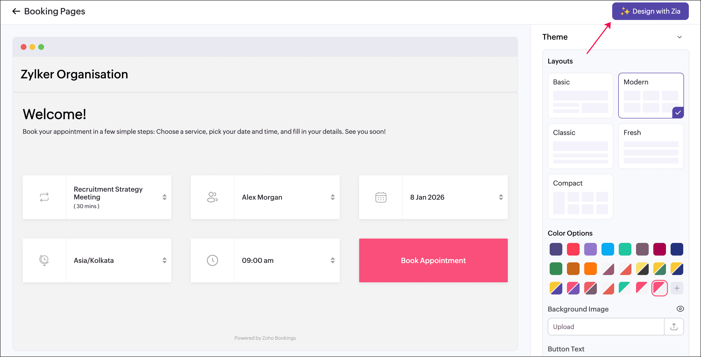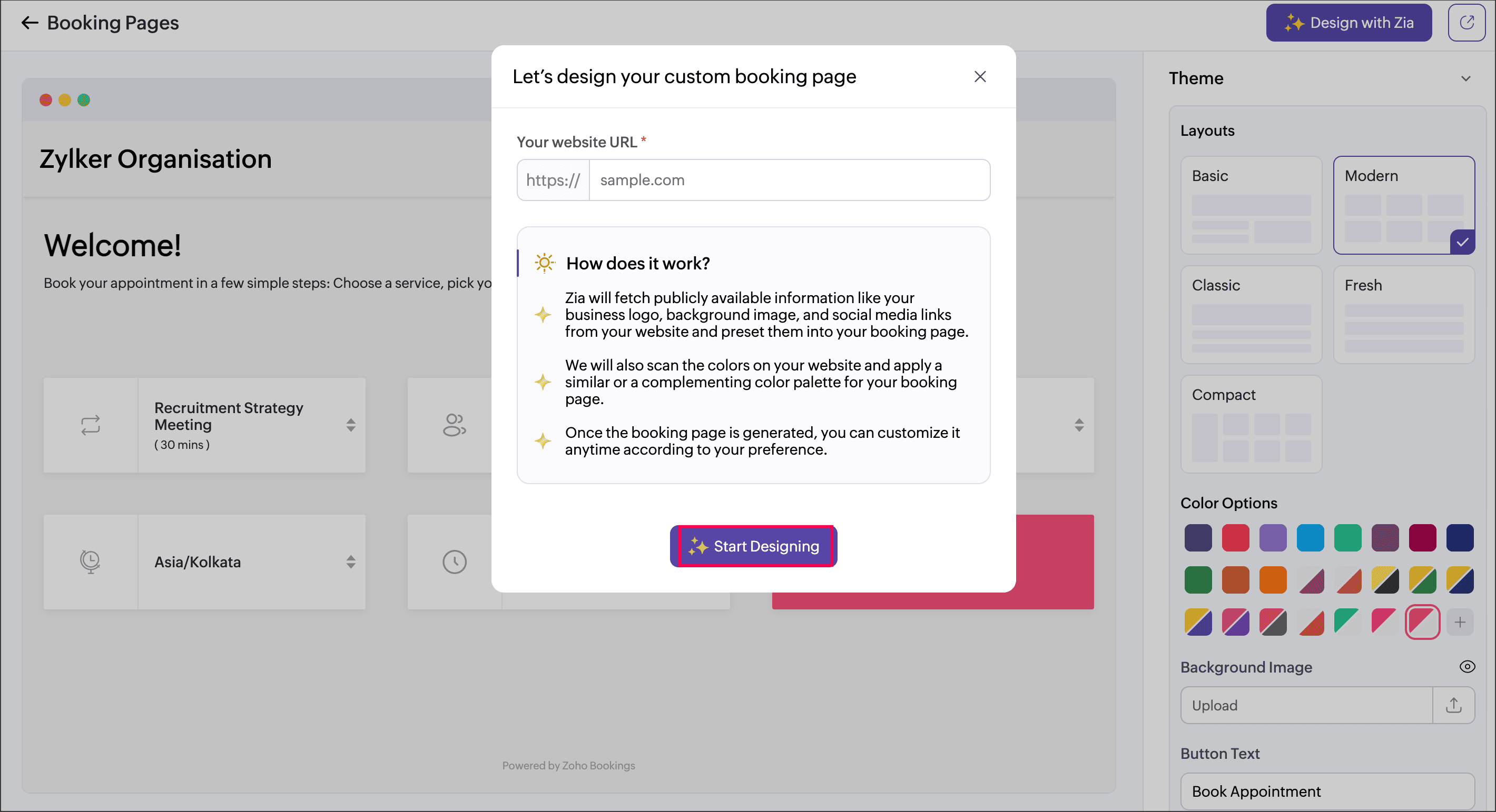 With a new AI-driven enhancement powered by Zia, Zoho Bookings can now automatically build and style your booking page based on your business website. Simply enter your website URL, and the system generates a page that aligns with your brand identity — saving time while maintaining consistency.