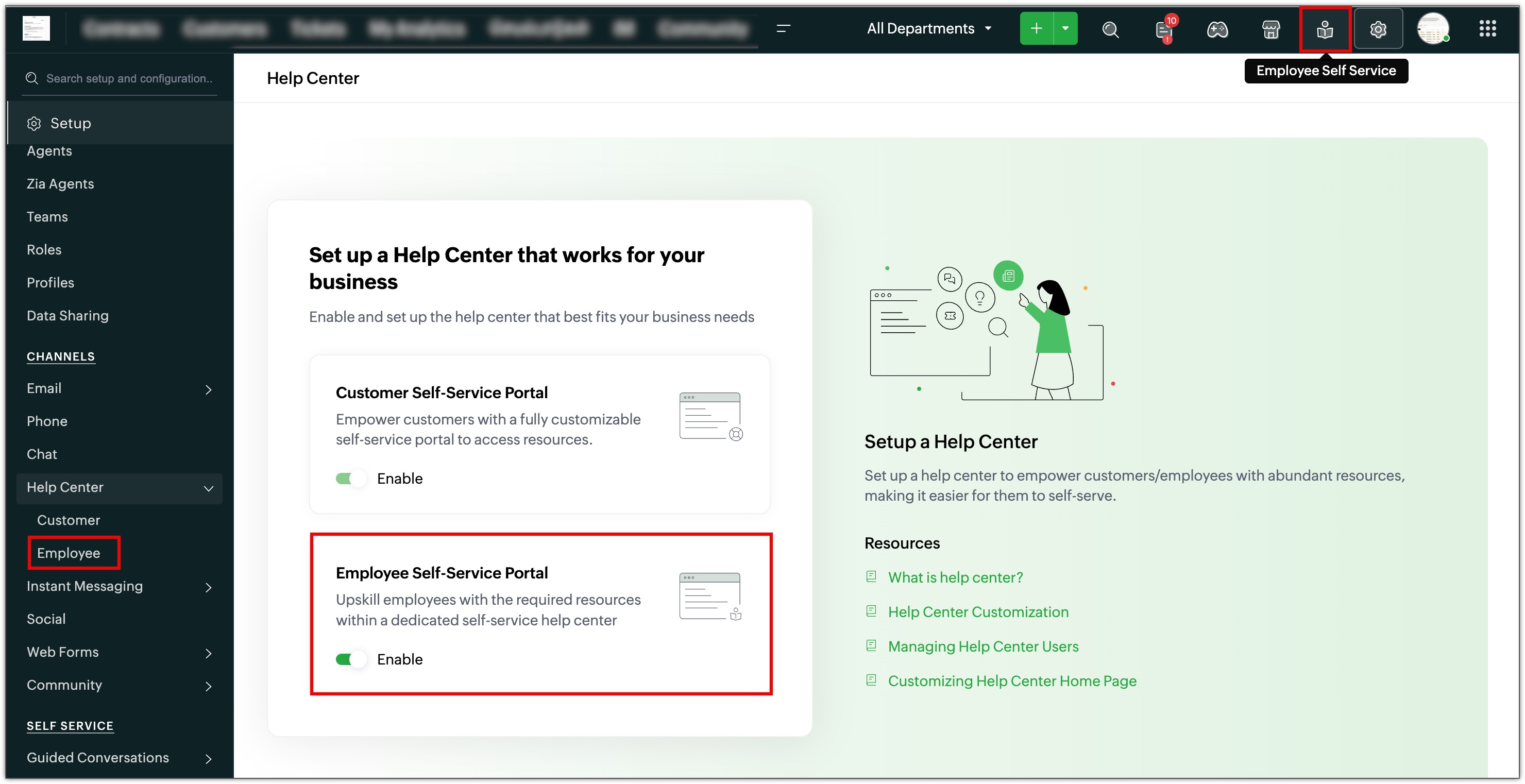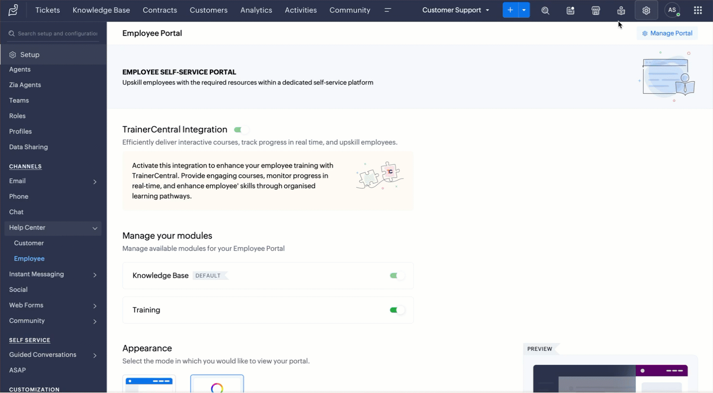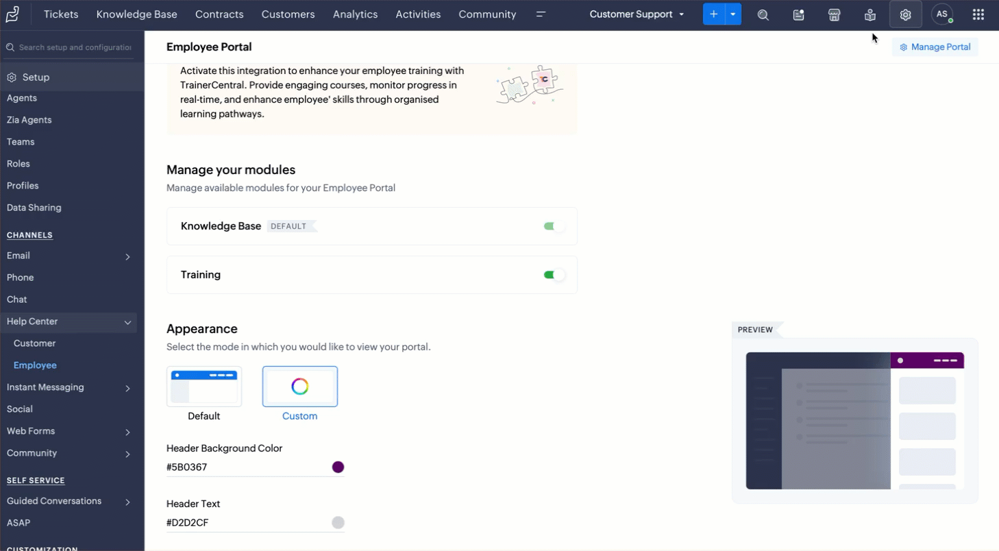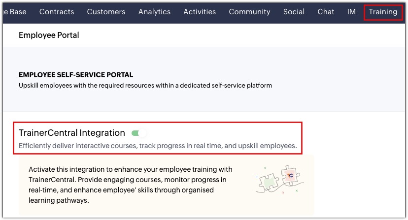 Pontosan ezért a Zoho Desk mostantól elhozza Önnek az Employee Self-Service Portált (ESSP ) és a TrainerCentral által támogatott képzési modult - egy teljes tanulási és beilleszkedési teret, amely közvetlenül a Deskbe épült.