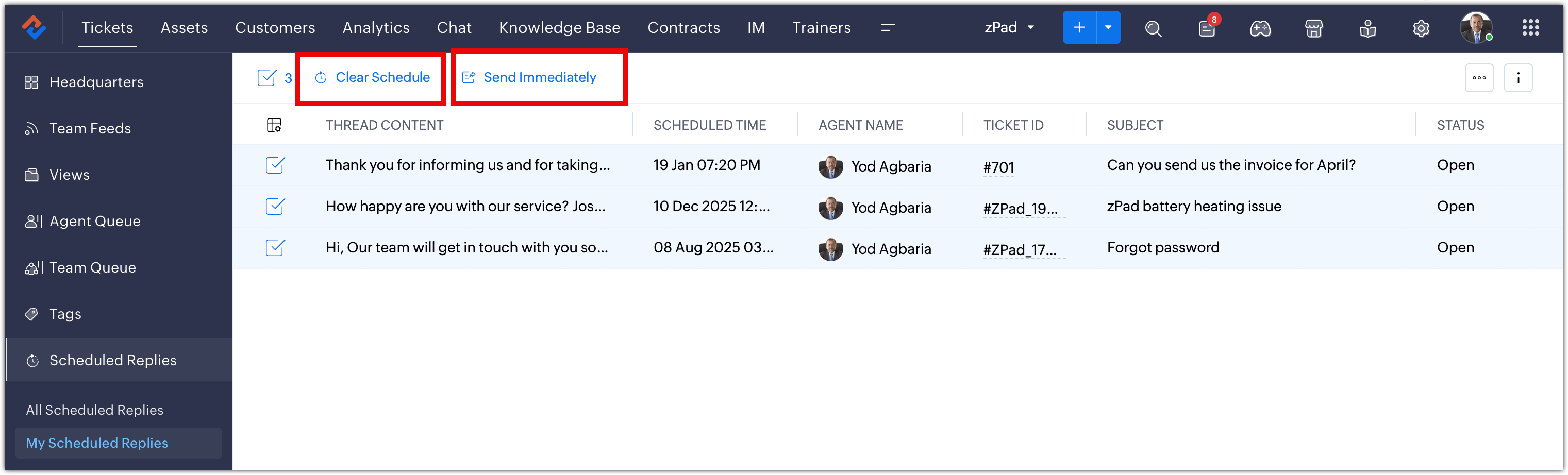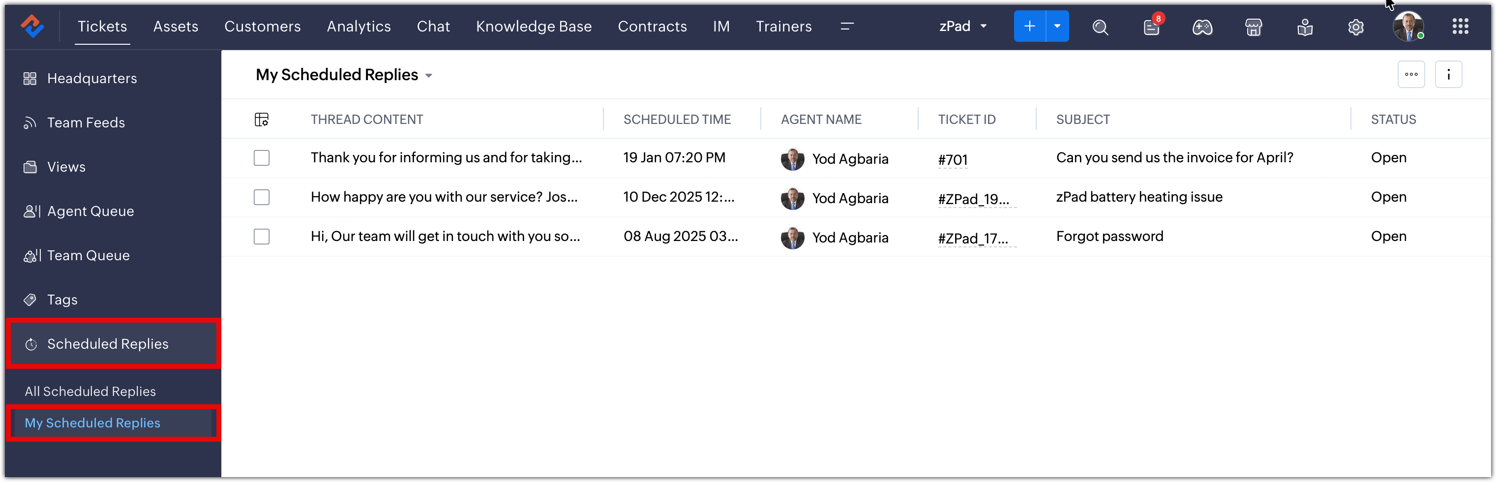 A táblázat olyan részleteket jelenít meg, mint a szál tartalma, a tervezett időpont, az állapot és az időzóna. Az ügynökök testreszabhatják a táblázatot, és olyan műveleteket hajthatnak végre, mint: