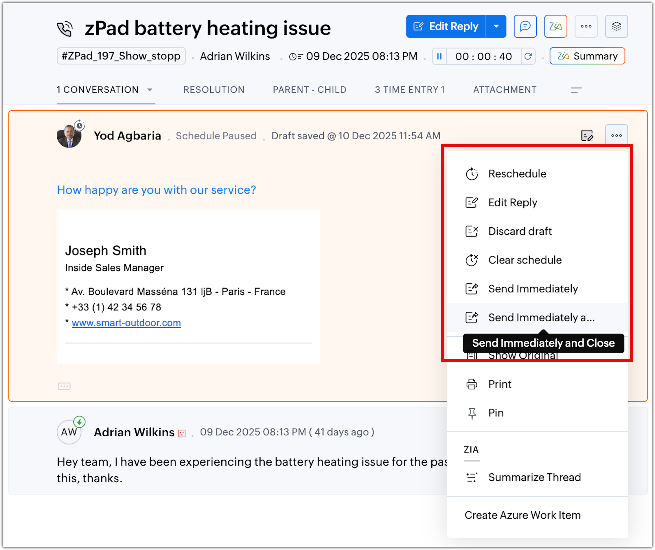 Azonnali küldés és bezárás: Küldje el a választ, és zárja be a jegyet.