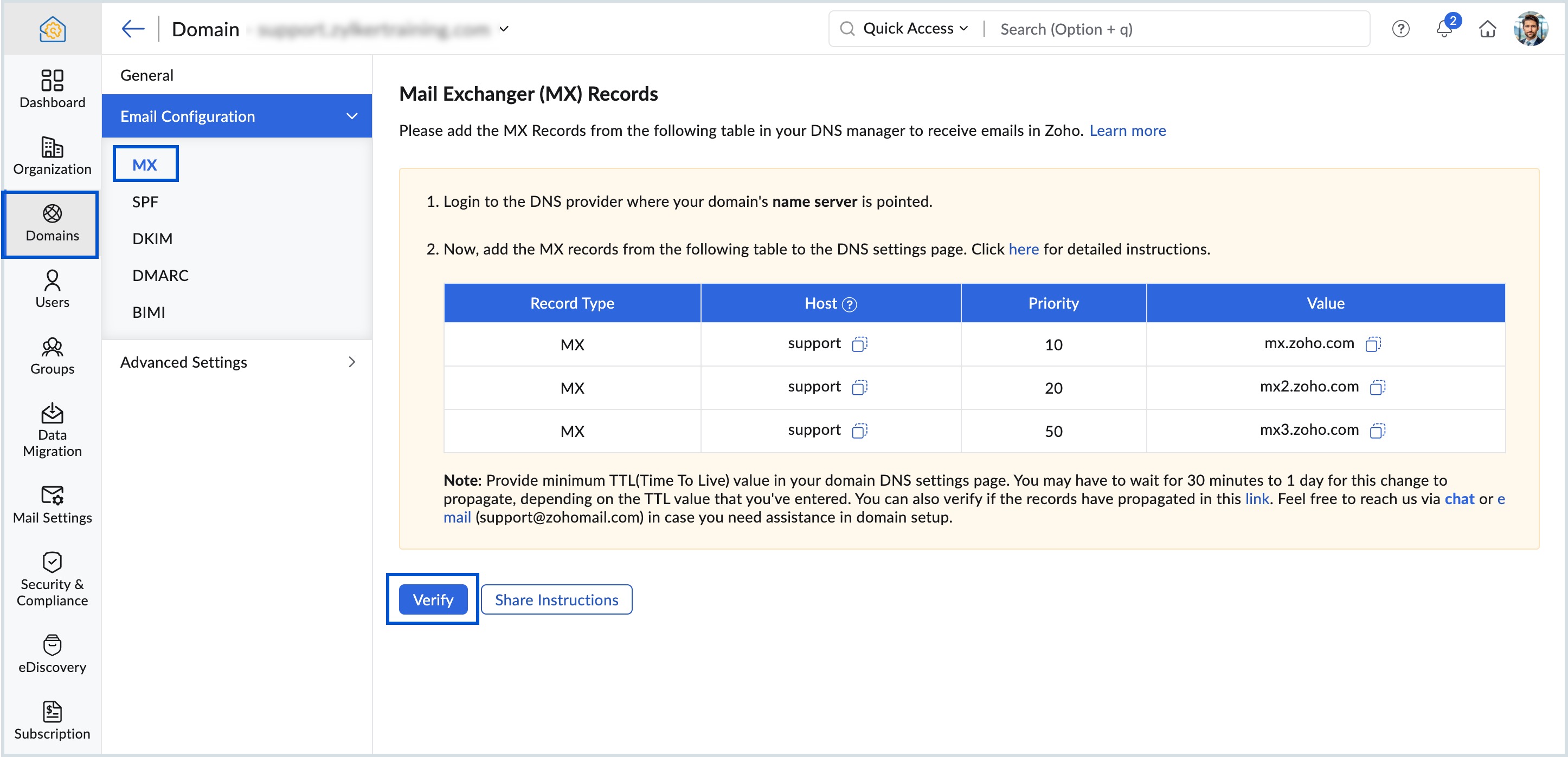 DNS-rekordok beállítása a Zoho Mailben