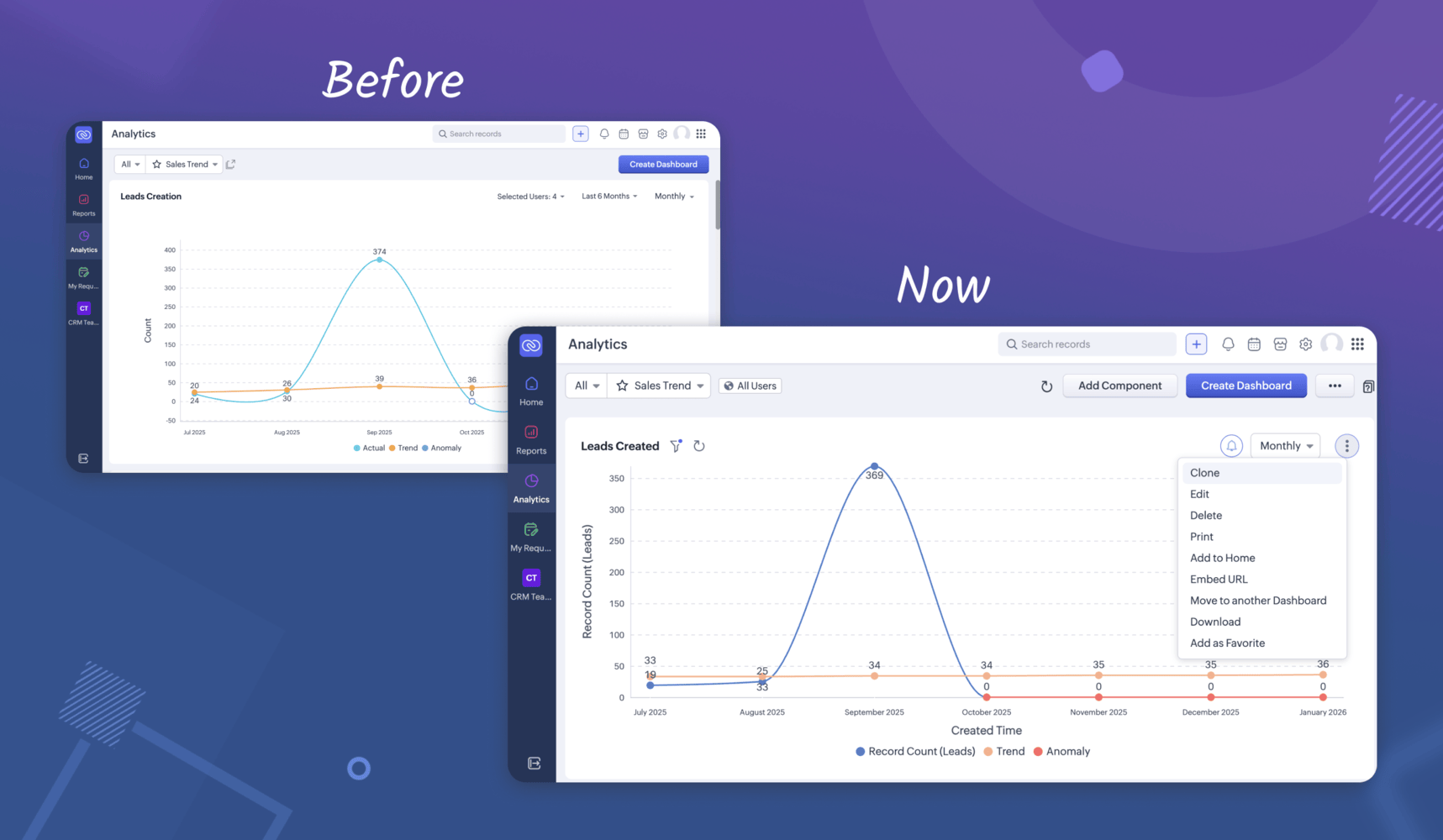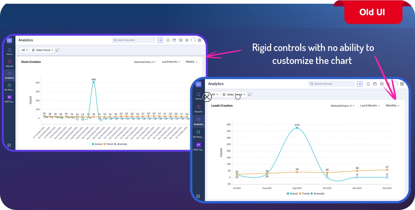 Panele trendów sprzedaży i trendów działań następczych związanych ze sprzedażą zostały przebudowane przy użyciu tej samej logiki, co niestandardowe komponenty anomalii dostępne w innych panelach.