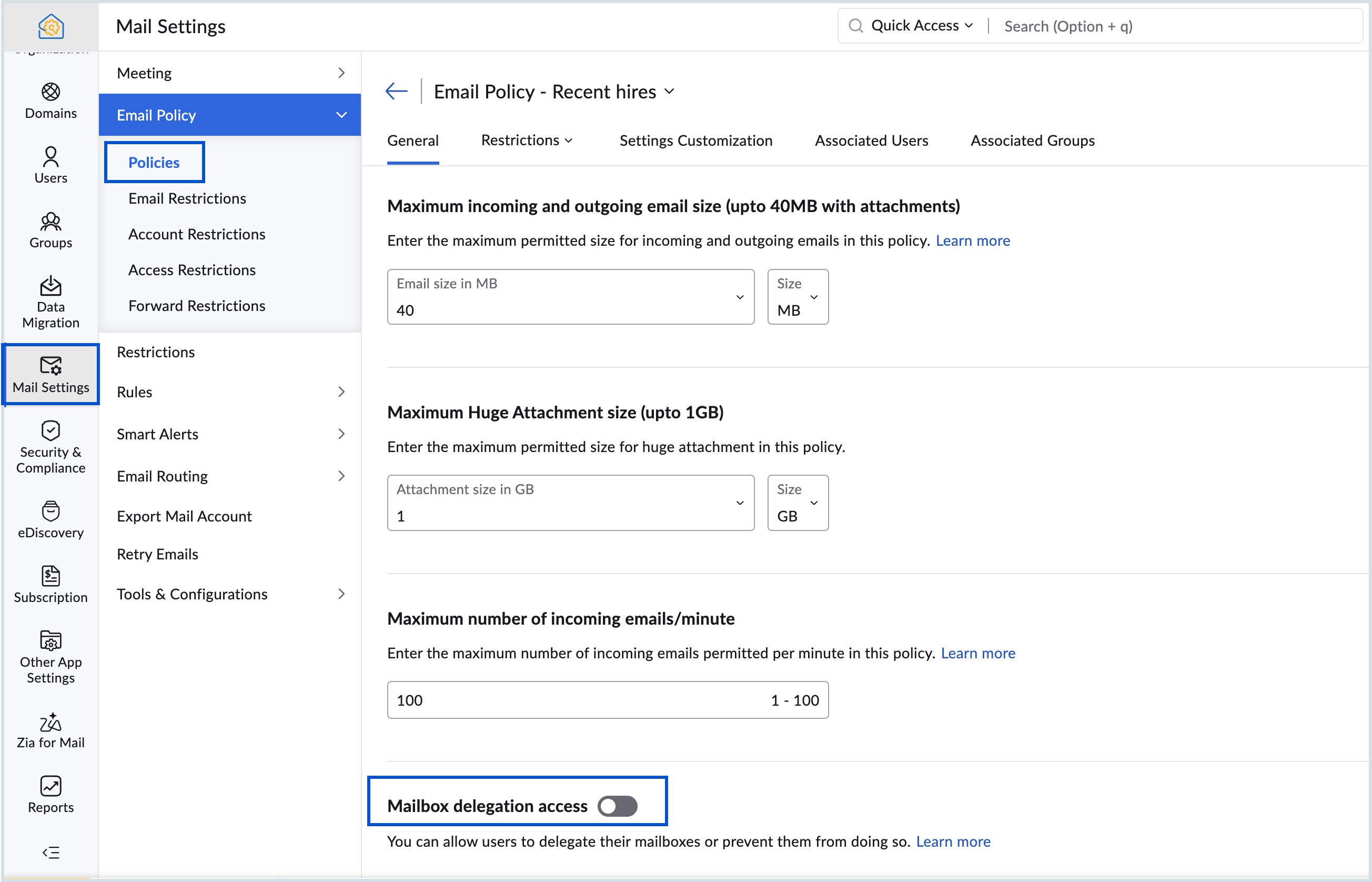 Aby rozwiązać ten problem, funkcjadelegowania skrzynek pocztowych w konsoli administracyjnej Zoho Mail pozwala upoważnionym użytkownikom bezpiecznie zarządzać wiadomościami e-mail w imieniu innego właściciela skrzynki pocztowej w organizacji — bez udostępniania danych uwierzytelniających.