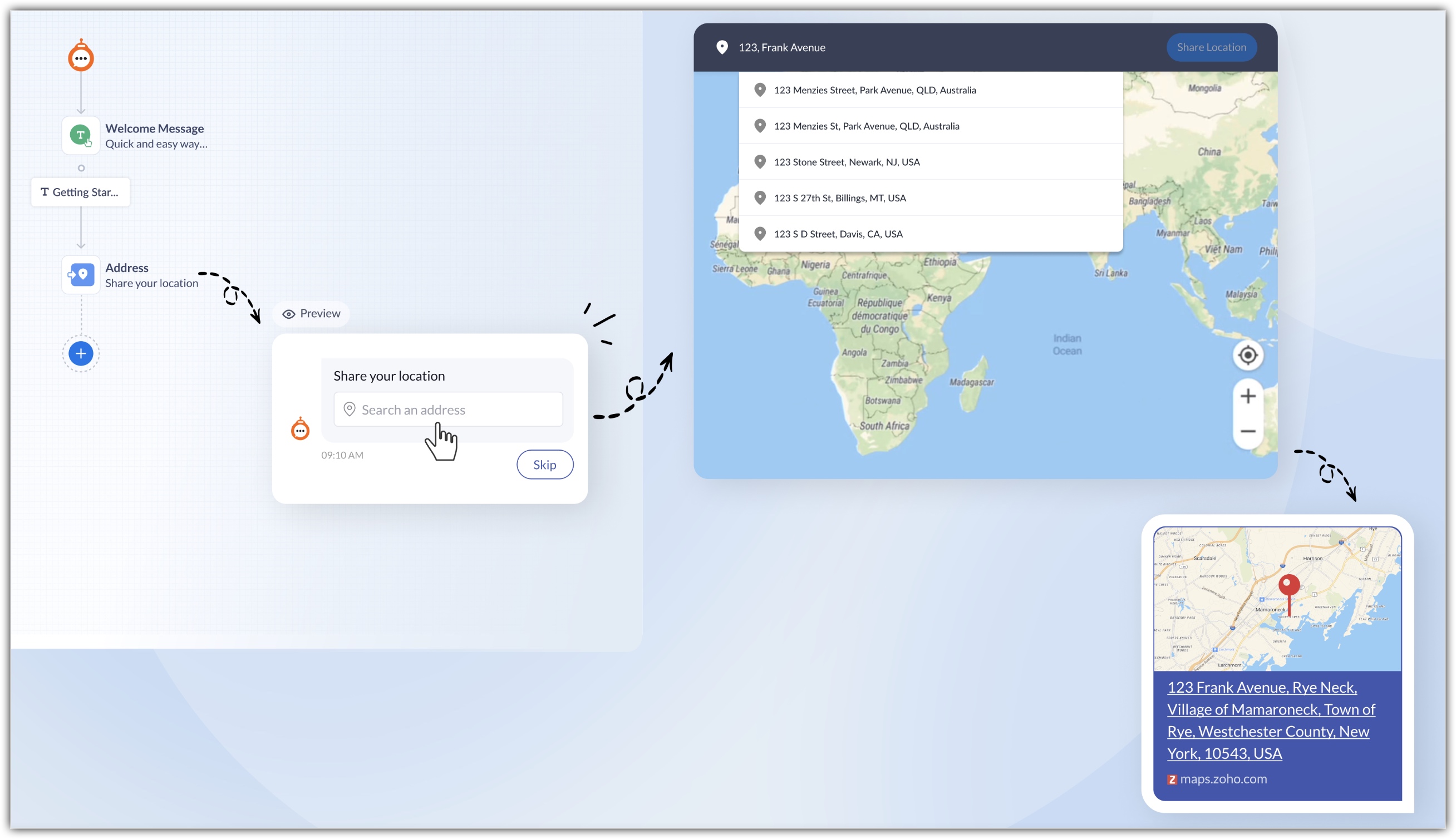 Am introdus acum Locația ca unul dintre tipurile de blocuri din cadrul blocului Întrebare. Acesta permite utilizatorului să împărtășească locațiile în direct sau adresele unor locuri specifice în cadrul sesiunii de chat. De exemplu, pe un site de cumpărături online, clientul poate trimite locația sa exactă. În plus, pe lângă aceasta, coordonatele locației vor fi, de asemenea, afișate în chat. Utilizatorii pot introduce o adresă în bara de căutare pentru a găsi locația exactă.
