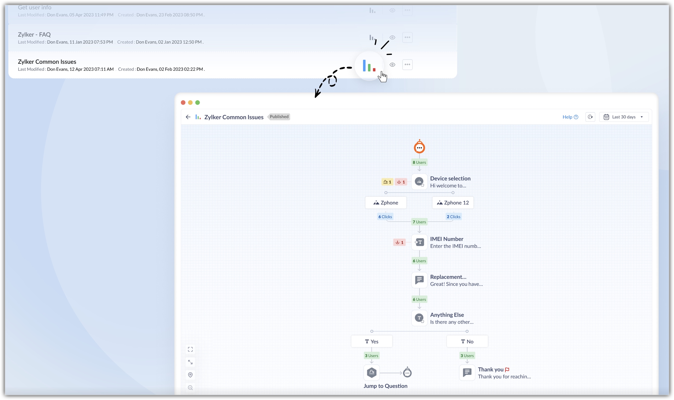 Flow metrics afișează modelul de utilizare în timp real. Evidențiază numărul de utilizatori care au intrat în flux, au participat la chat, traseul pe care l-au parcurs și multe altele. Detalii ca acestea pot ajuta organizațiile să îmbunătățească fluxurile pentru o mai bună adoptare și o utilizare sporită. Câteva informații importante care pot fi extrase din metricele fluxului sunt: