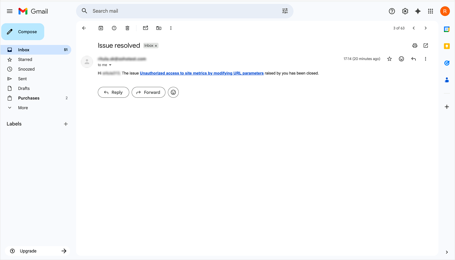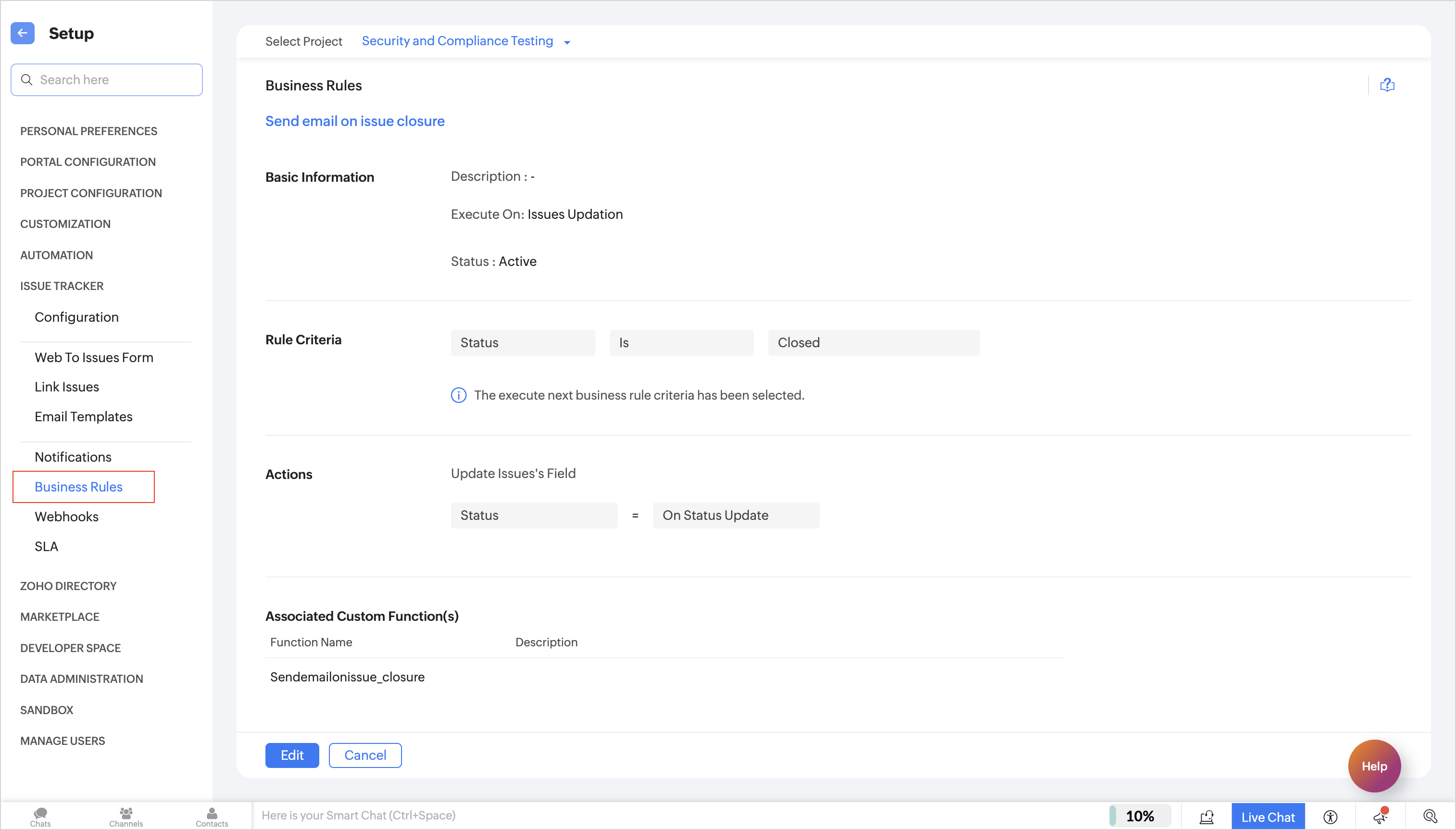 În Zoho Projects, puteți trimite automat un e-mail utilizatorilor externi atunci când o problemă este marcată ca fiind Închisă. Acest lucru elimină necesitatea urmăririi manuale și ține raportorul informat instantaneu.