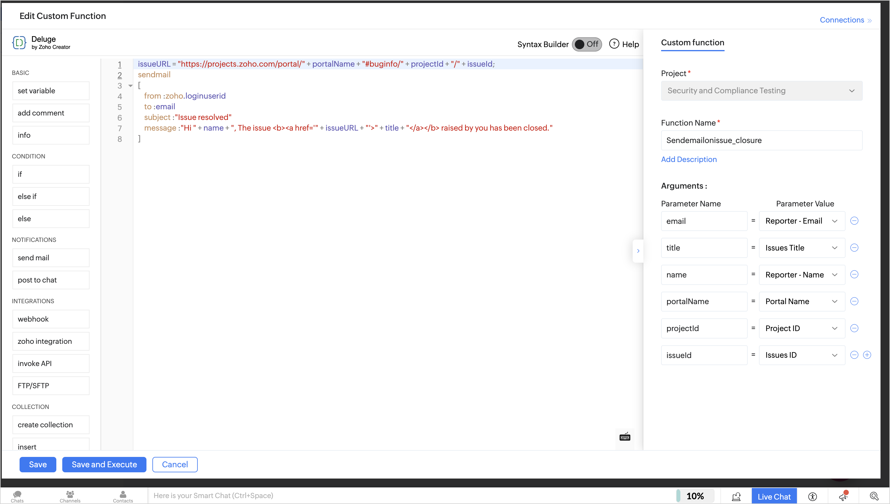 În fila Probleme, creați o funcție nouă și adăugați un script Deluge pentru a trimite notificarea prin e-mail.
